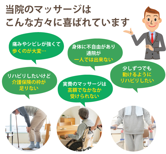 - 国家資格者である「あん摩マッサージ指圧師」が身体機能の回復維持を目的として、ご利用者様お一人お一人の状況に合わせてマッサージ治療を行います。